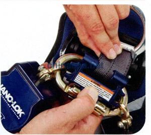 5.將鉤環(huán)開口端掛到背部D型環(huán)下方松垂的織帶上,依次安裝第二個(gè)自鎖速差器
