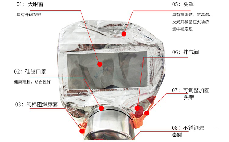 發(fā)生火災(zāi),產(chǎn)生的熱輻射大,雖然你離著火點(diǎn)很遠(yuǎn)但也有可能被熱量燙傷,而逃生面具的頭罩是采用內(nèi)阻燃棉布,外涂覆鋁箔材質(zhì),具有很好的防熱輻射的。而且防火面具都是銀光閃閃的,防止熱輻射的同時(shí)還便于被營(yíng)救,而防毒面具并沒有有這樣的設(shè)計(jì)。